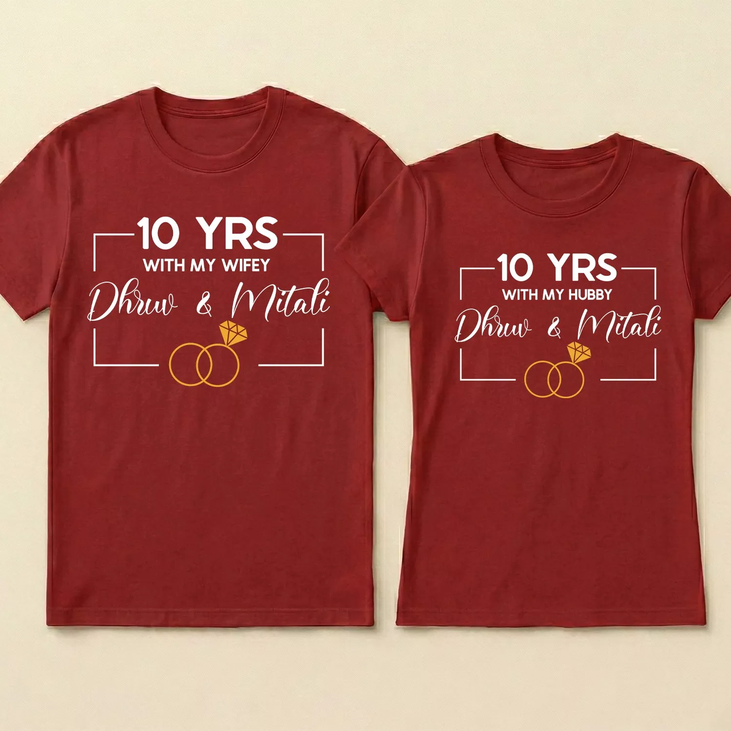 The print features a clean, contemporary design that beautifully represents ten years of togetherness. The subtle celebration elements, such as minimal icons or number-based typography, make the tees visually appealing without being overwhelming.