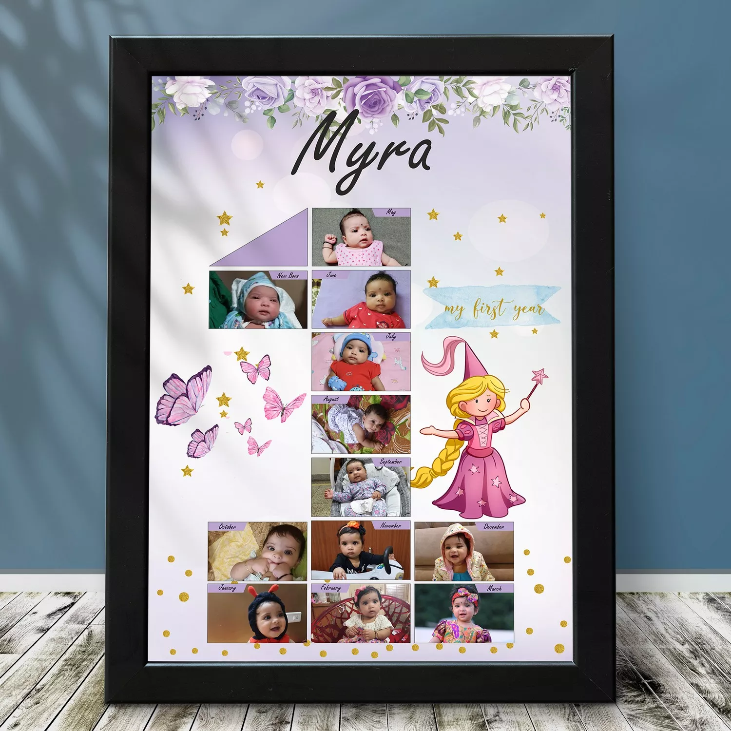 Capture every precious milestone of your baby girl’s first year with this beautifully designed personalized princess-themed photo frame. Featuring space for 12 monthly photos and your baby’s name, this collage frame turns her first year into a magical memory you can display forever.