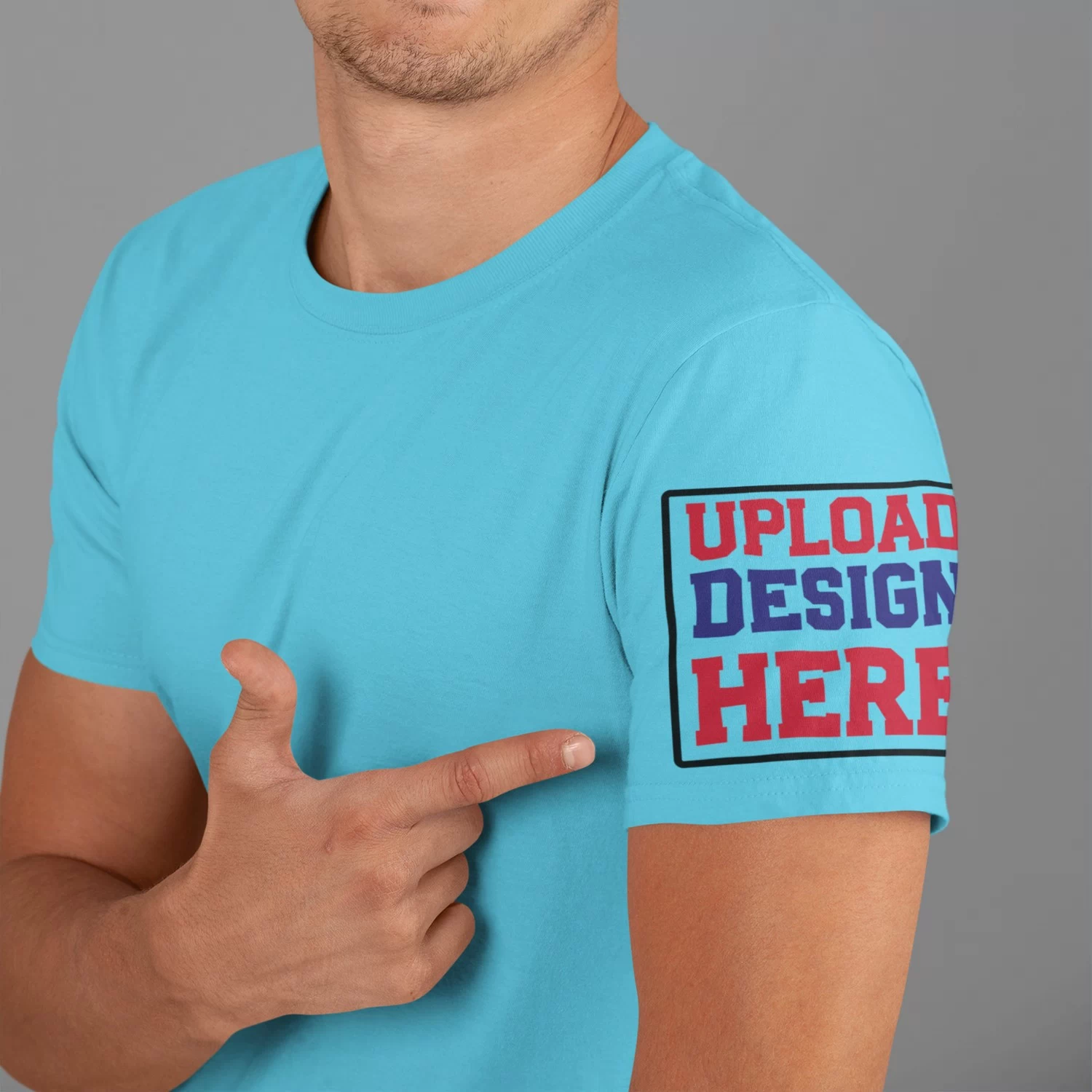 Make it truly yours! Customize this premium cotton Sky Blue round neck T-shirt with your design on the front, back, sleeves, or pockets.