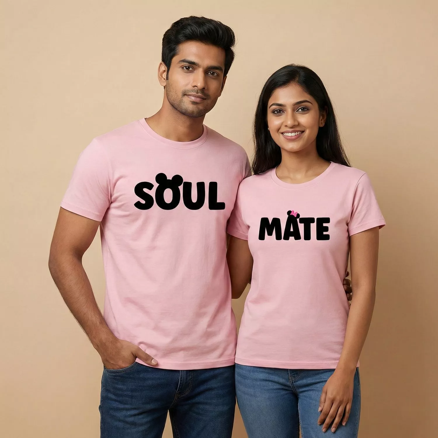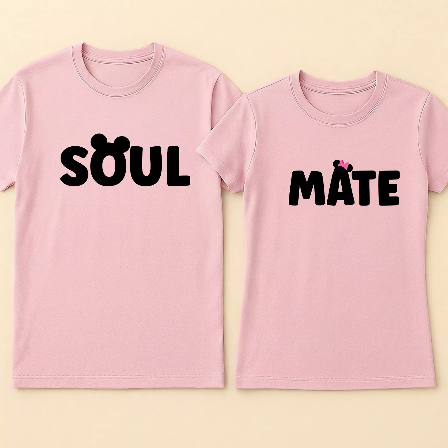 The word “SOUL” appears on one shirt, featuring a recognizable mouse silhouette with round ears replacing the letter ‘O’. The partner shirt features “MATE,” with the letter ‘A’ topped by ears and a cute pink bow. This inspired graphic design adds a touch of childhood nostalgia and magic, making these shirts a favorite for couples who love theme parks and animated classics.